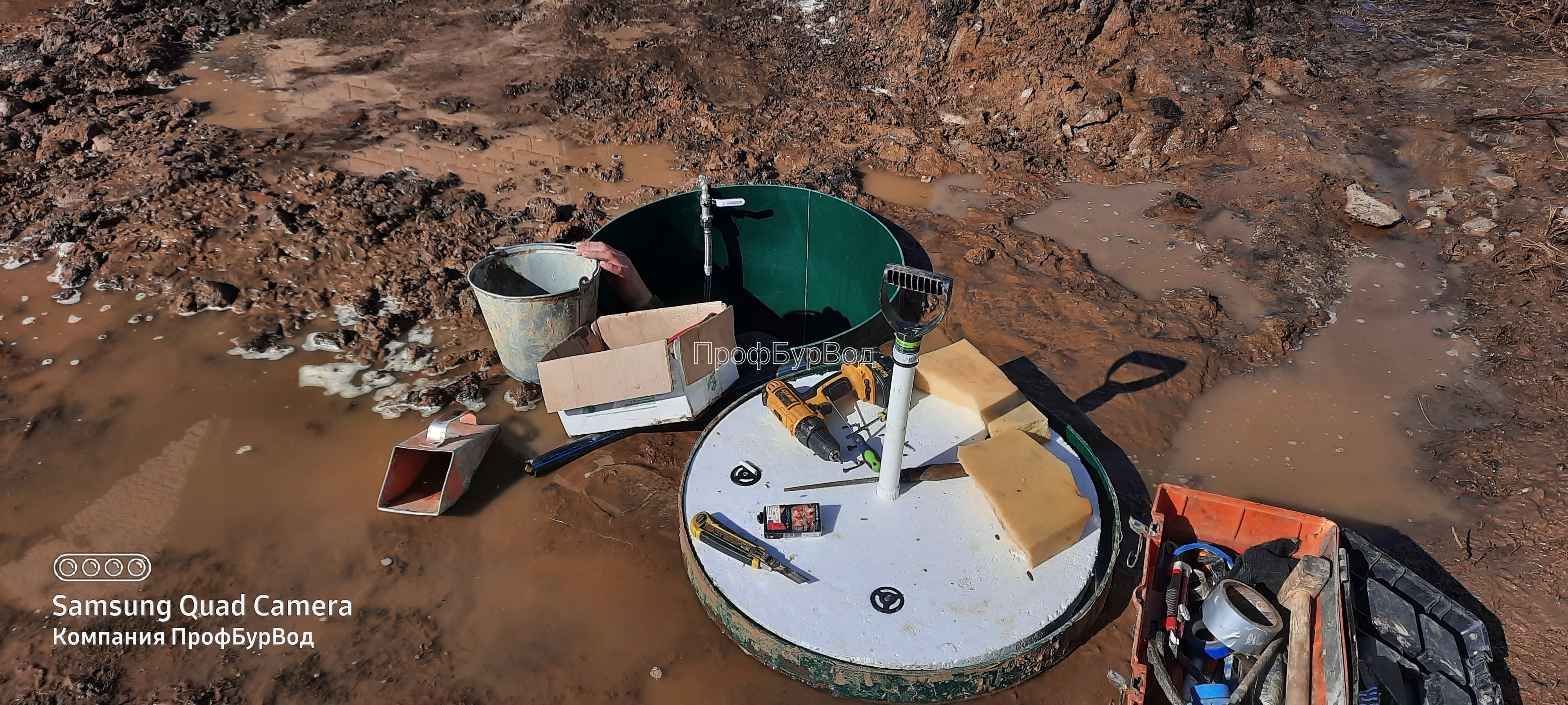 Мы выполнили обустройство скважины в СНТ Машиностроитель Конаковского района. Это был интересный объект, так как монтаж осложнялся тем, что происходил зимой и осуществлялся в плывуне. Нашим сотрудникам пришлось работать по пояс в воде, но мы успешно справились.